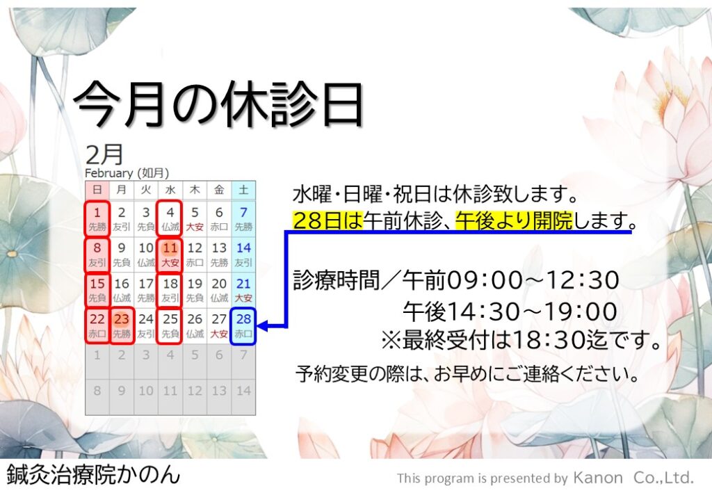 鍼灸治療院:2月のカレンダー